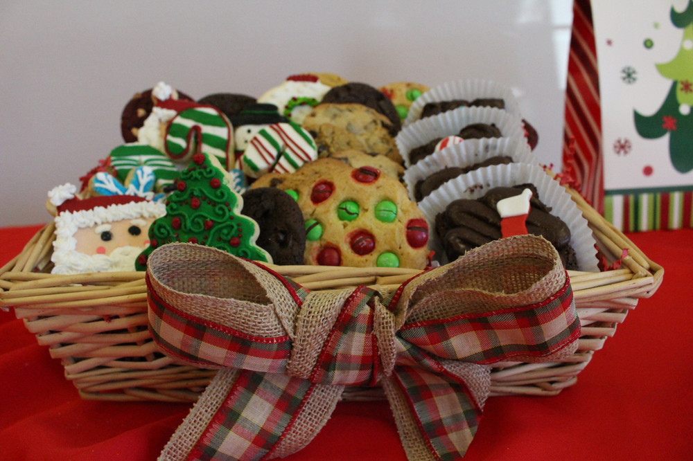 A Christmas Dream Come True! This Christmas basket includes a dozen of our beautifully hand decorated Christmas cookies, a dozen of our freshly baked gourmet cookies individually wrapped chocolate chip, oatmeal raisin, double chocolate, red velvet, rainbow and snicker doodle cookies and four delicious chocolate frosted brownies with pecans. A delightful gift for friends and family!