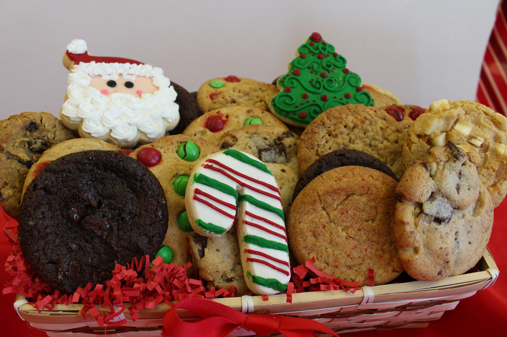 What a way to send Christmas wishes with this Gourmet Cookie Basket filled with 24 freshly baked and individually wrapped chocolate chip, oatmeal raisin, double chocolate, red velvet, rainbow and snicker doodle cookies and three of our hand decorated Christmas cookies.
