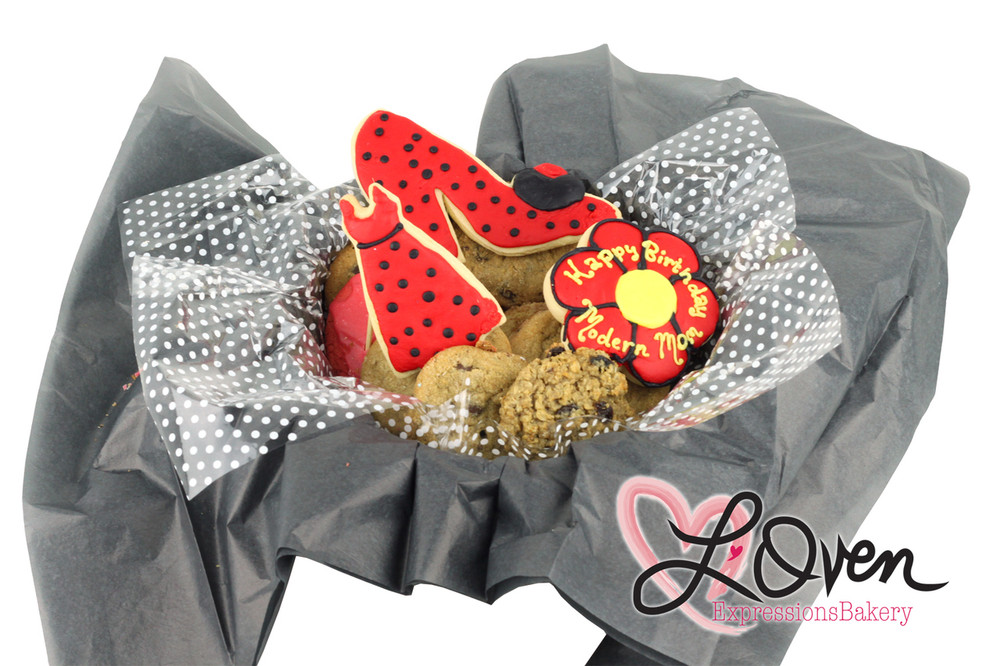 This basket is two dozen of our freshly baked gourmet cookies, and 3 hand decorated gourmet cookies. A delightful gift for friends and family!